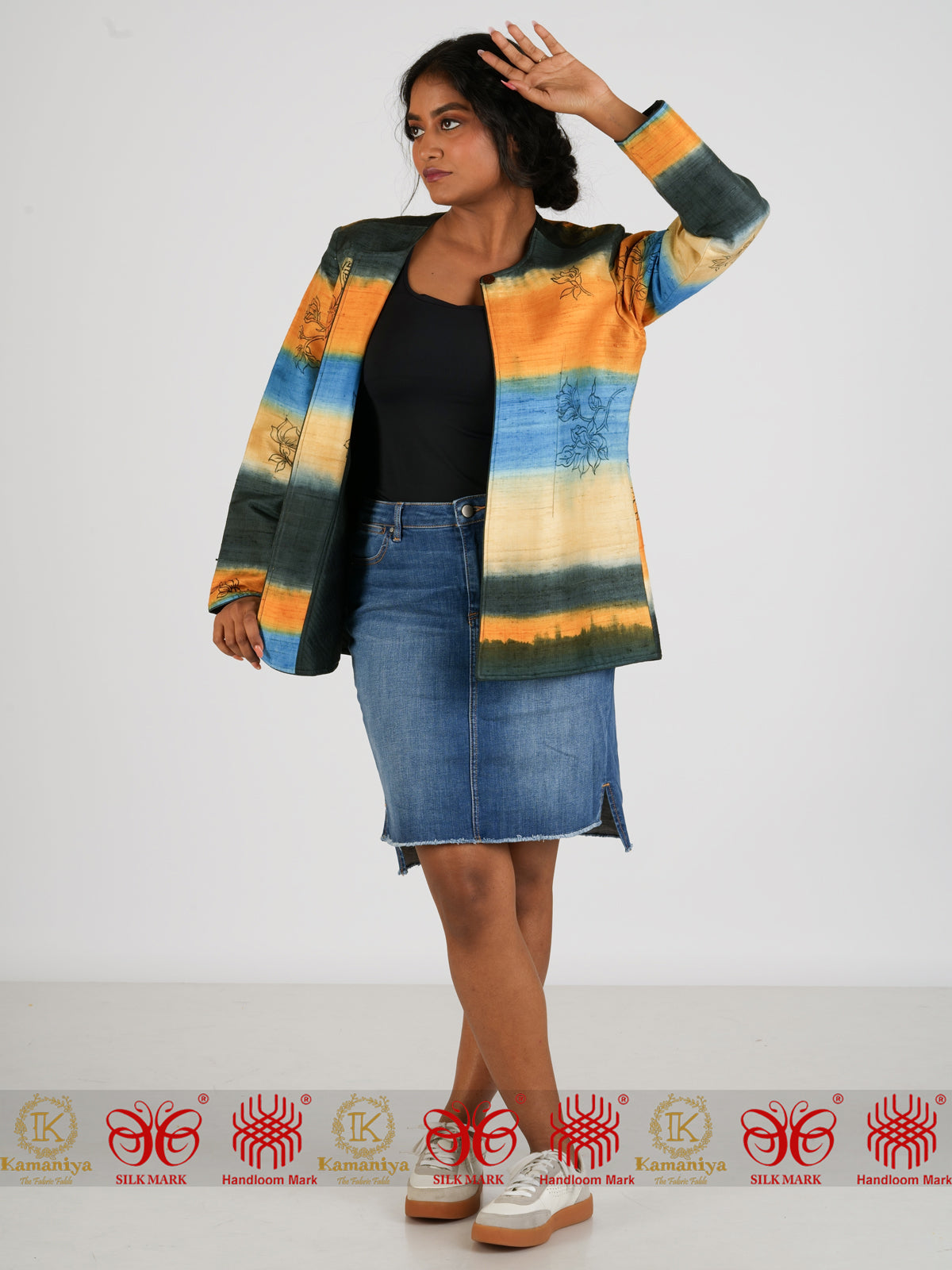 Block your day with an unusual combi of colors in this coat. Orange, blue and black bring lotus motifs to earth, sky and dark tones of life. What an ode to flower power.