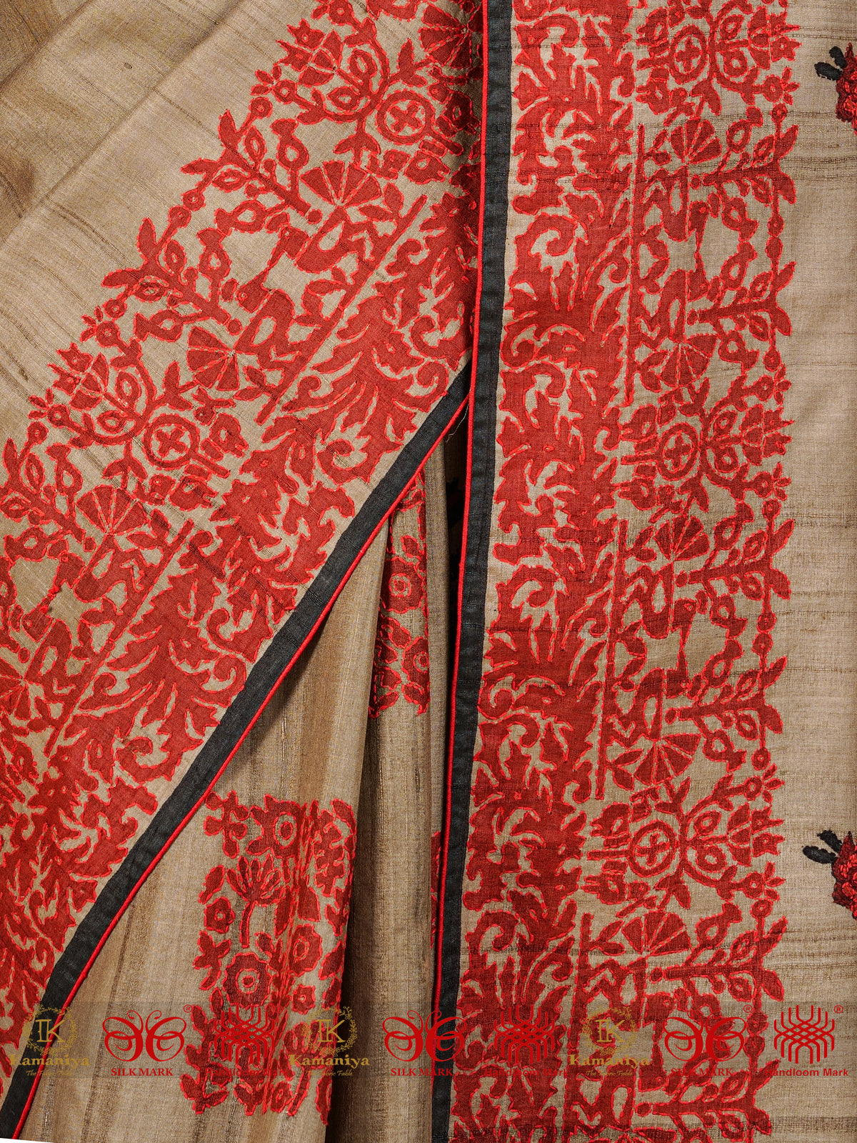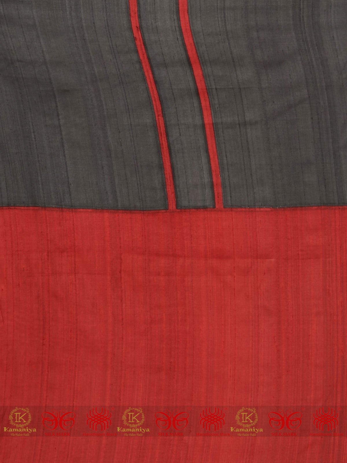 This flowery tussar saree will welcome spring with open arms. The pure tussar color and texture is pepped up with a red border and cement grey and fiery red flower motifs that seem like the color of burning embers. The feeling when you wear this saree is refreshing with a sizzling charm!