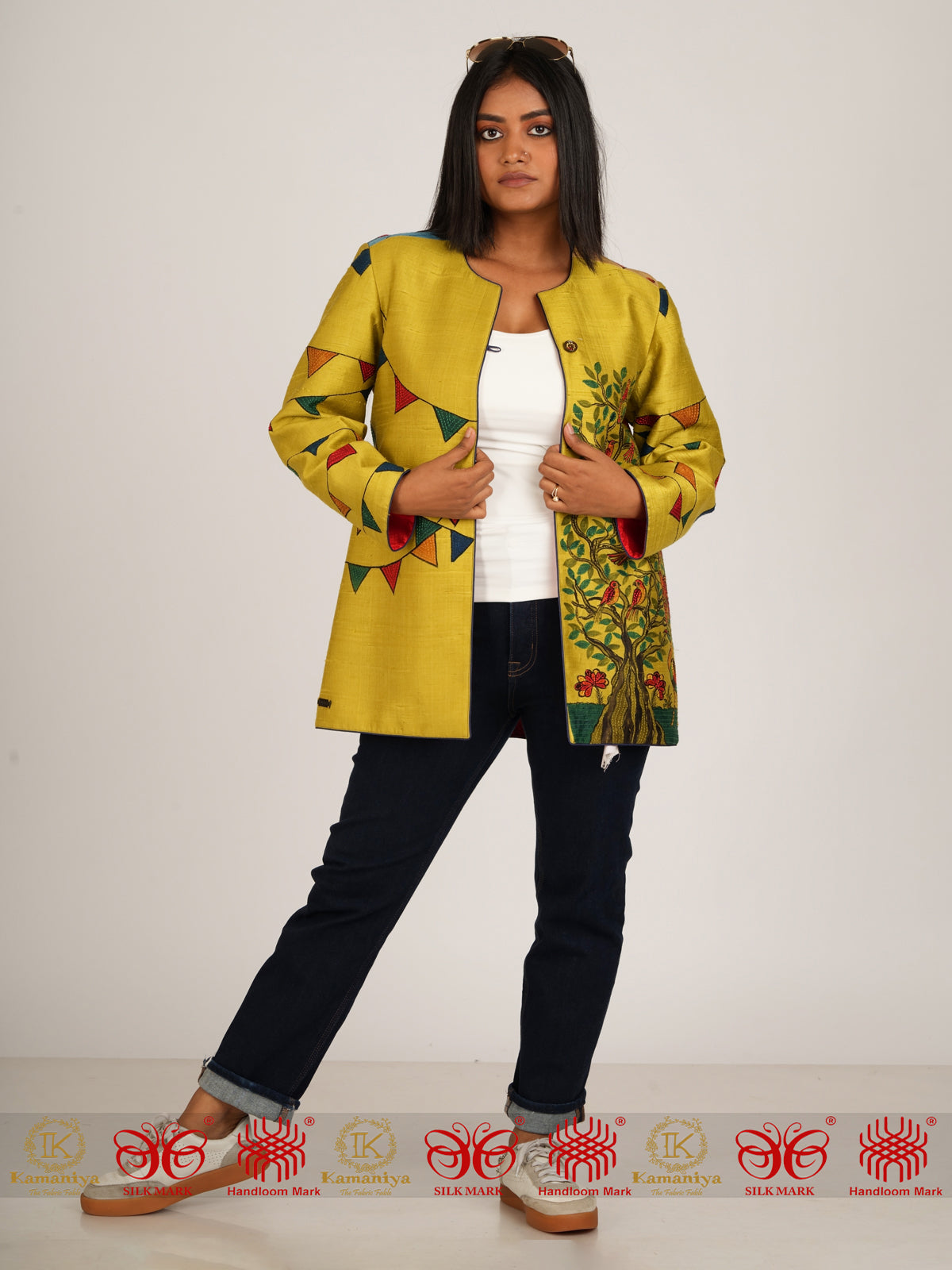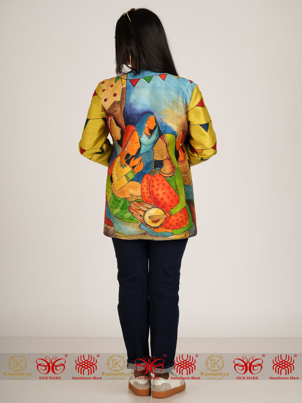 Fusion of colors and style in this coat stands time still in its art forms. Beat the drums of desi designs in this jacket anytime you feel like this season.