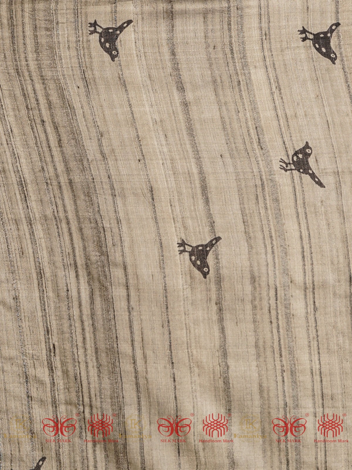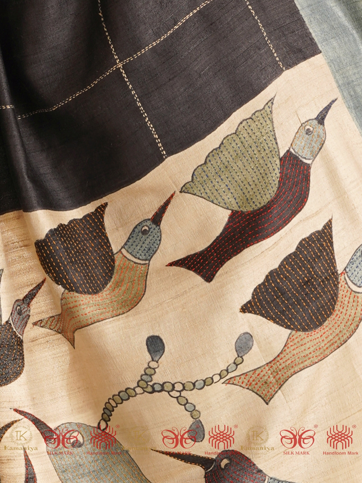 The flying mythical bird motif comes in all its artistic glory in yet another masterpiece from Kamaniya. This black and white sari with bold, box cheques on the body, is a perfect party wear.