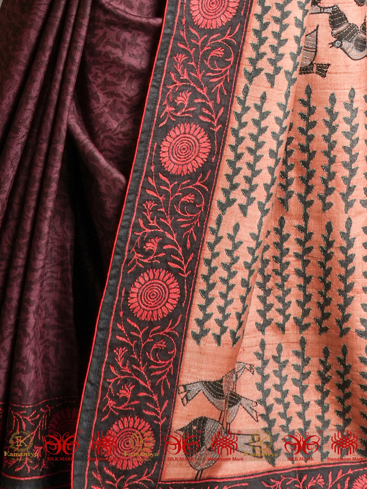 This flirty sari has bird, flower and foliage motifs. The color combination of maroon, rust and red is amazing and so silky. The pulla has a neon effect in beige that highlights the motifs so well. While away your spare time in this sari and step out for some fun!